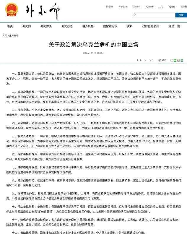 2月24日,中国外交部网站发表《关于政治解决乌克兰危机的中国立场》。毫不夸张地说,举世瞩目。其中当然也包括乌克兰方面。