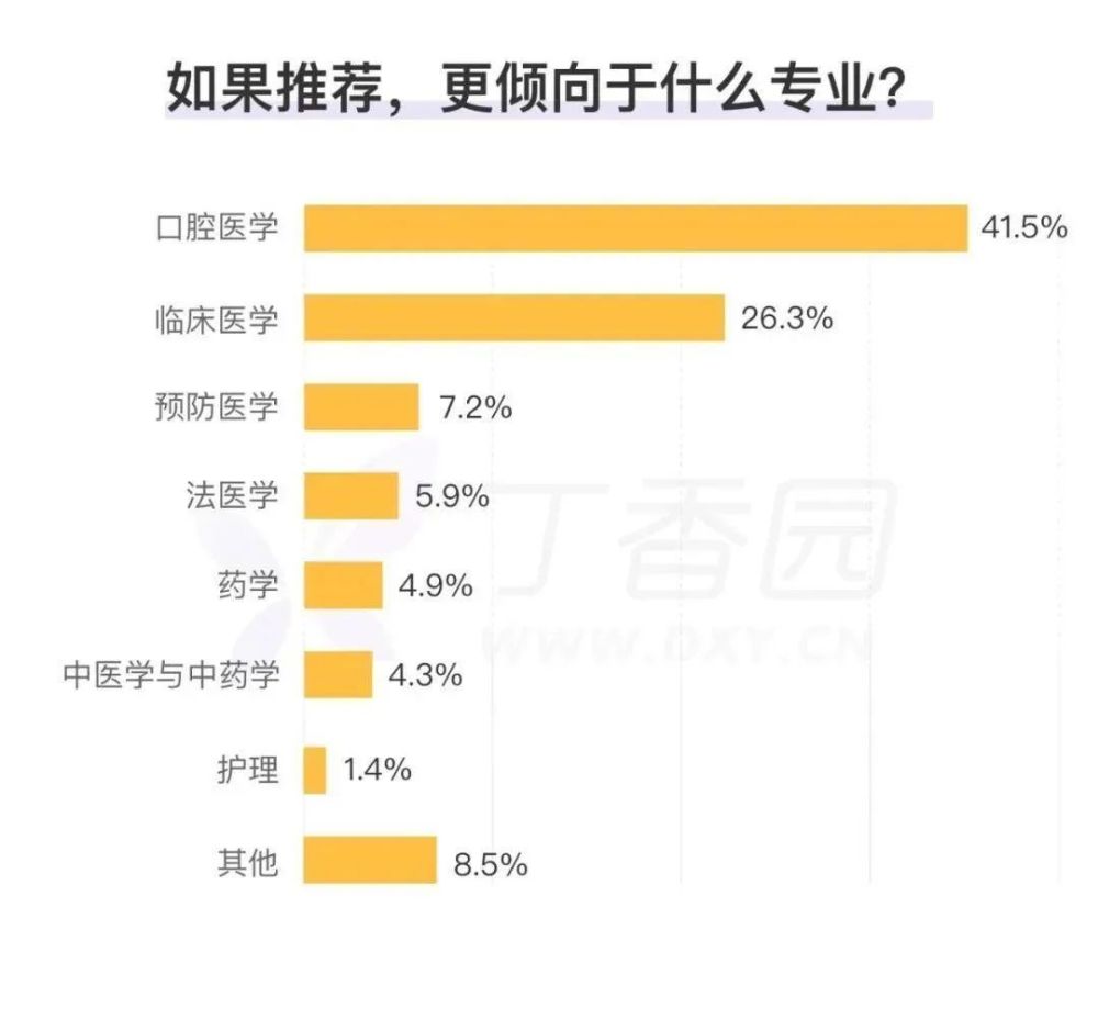 之前,丁香园曾邀请1639名医护人员进行了一项调查,包括在读医学生340人,已经工作医护人员1267人,已转行医护人员32人,结果显示,在推荐专业这项调查里,有41.5%的人都选择了口腔医学,紧跟其后的是26.3%临床医学,那么这些医学生和医护人员推荐最多的专业到底是学啥的?我们今天就来讲讲!
