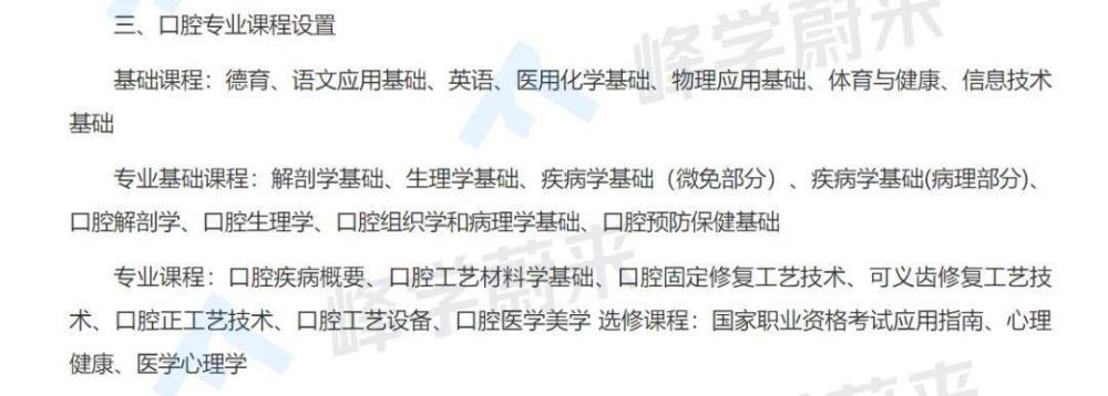具体相关课程:开设口腔医学专业的院校,一般主要课程设置包含物理学、生物学、口腔解剖生理学、口腔组织病理学、口腔材料学、口腔内科学、口腔颌面外科学、口腔修复学、口腔正畸学等。